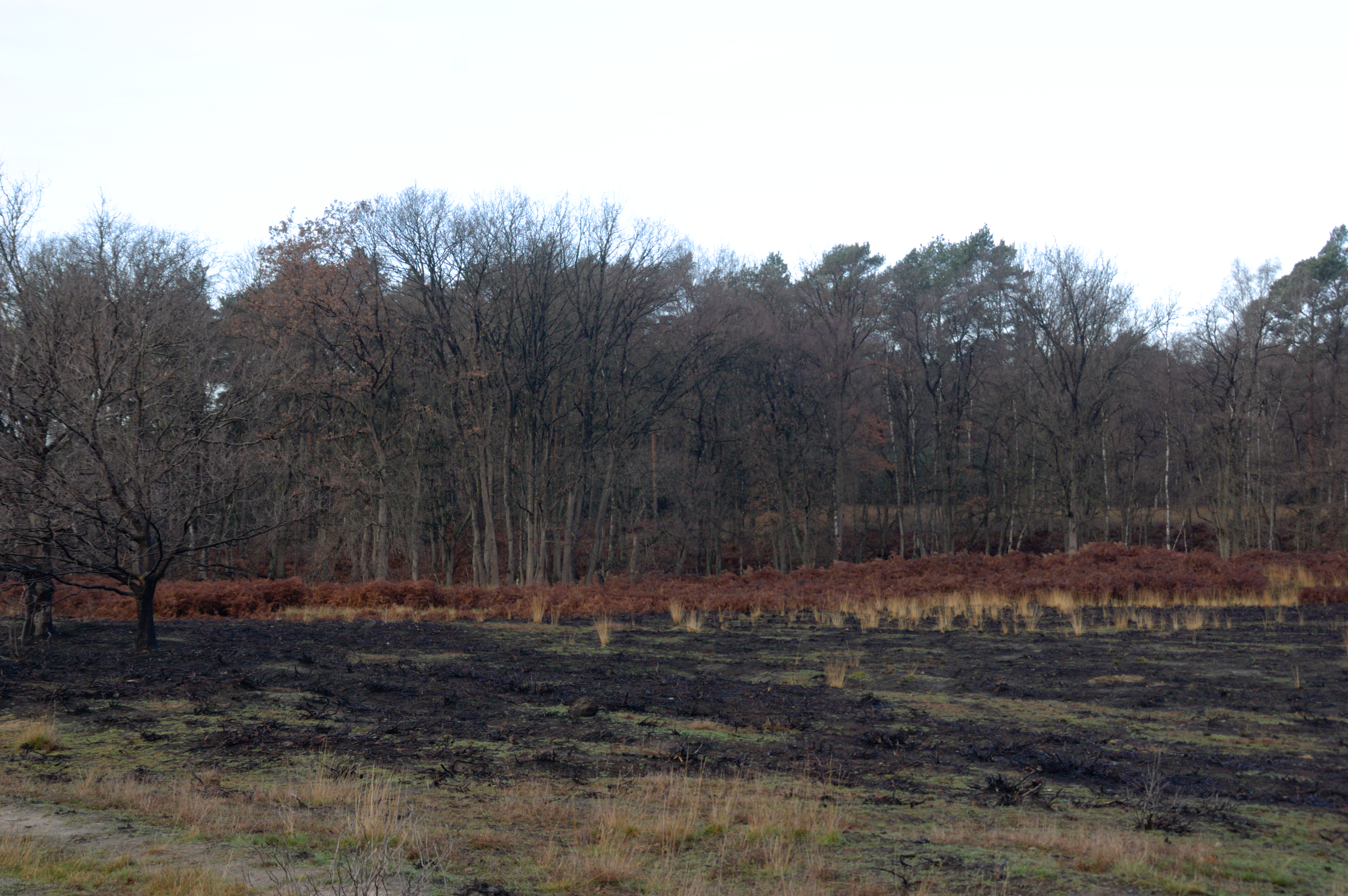 In het Meinweggebied is einde én nieuw begin zo prachtig zichtbaar in de natuur… De enorm grote brand die afgelopen voorjaar woedde heeft grote gaten geslagen in dit mooie gebied. Je kunt het zelfs nog ruiken. Maar het nieuwe leven is alweer zichtbaar …..eigenwijze lichtgele grasachtige pollen die met een soort van  meetkundige precisie  boven de grond uitkomen  en netjes in het gelid  opgesteld staan tussen de verbrande heide struiken. Ze vangen  de stralen van het waterige zonnetje en geven zo kleur aan de verschroeide natuur.. En als je goed kijkt naar een zwart geblakerde boom zie je plots kleine stukjes lichtgekleurd  hout dat nog  wel levend  lijkt te zijn.  De  stromende beekjes zoeken kronkelend hun weg naar de grotere poelen en vennen.. Grote bomen staan fier rechtop, ze zijn de verzengende vuurdans ontsprongen en samen met de bruinrode varens doet het afgevallen blad de bodem oranjerood oplichten..