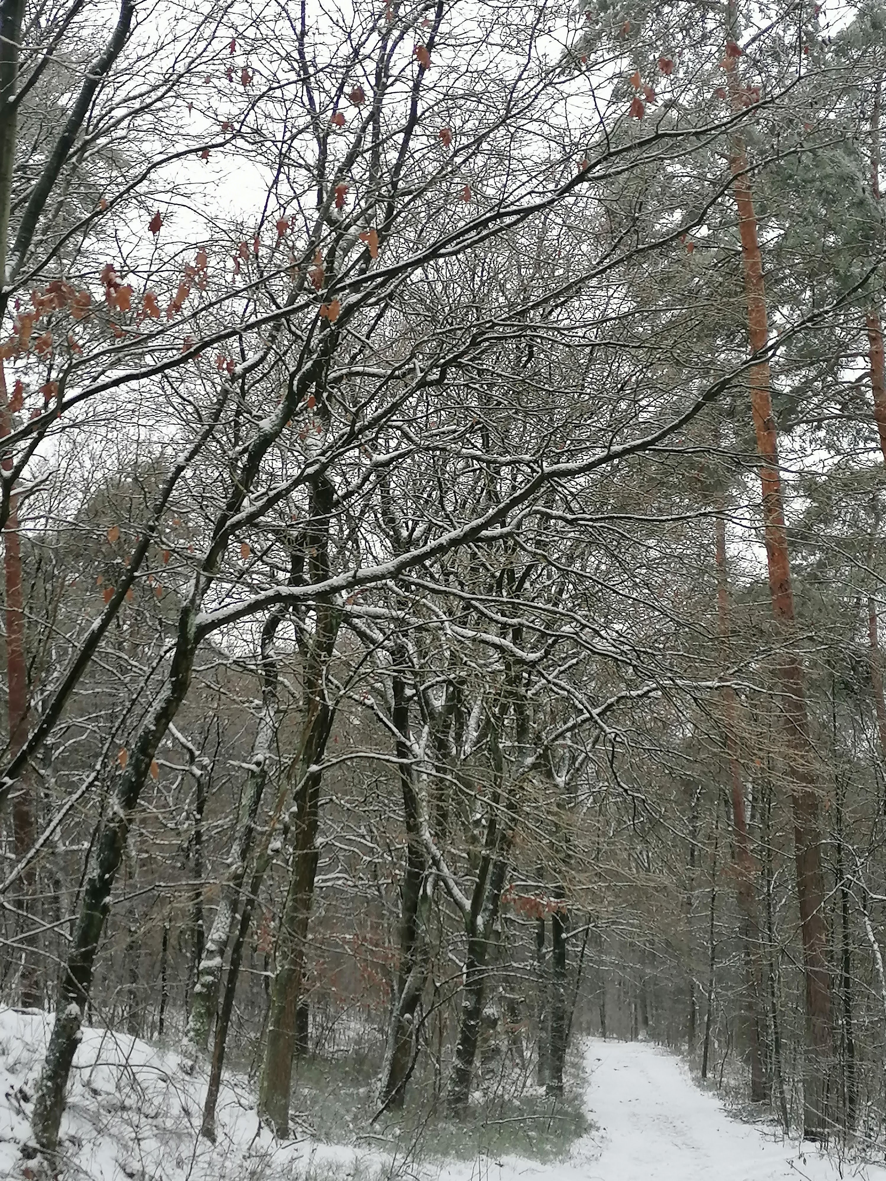 Zondagmiddag, staalgrijze lucht met hier en daar nog een verdwaalde sneeuwvlok…In het bos, wandelaars, ouders met kinderen, speelse honden die happen naar de sneeuw. Een slee, een sneeuwpop, rode wangen, kleurrijke mutsen, sjaal en jassen. Plezier en gelach…. Veel om van te genieten.