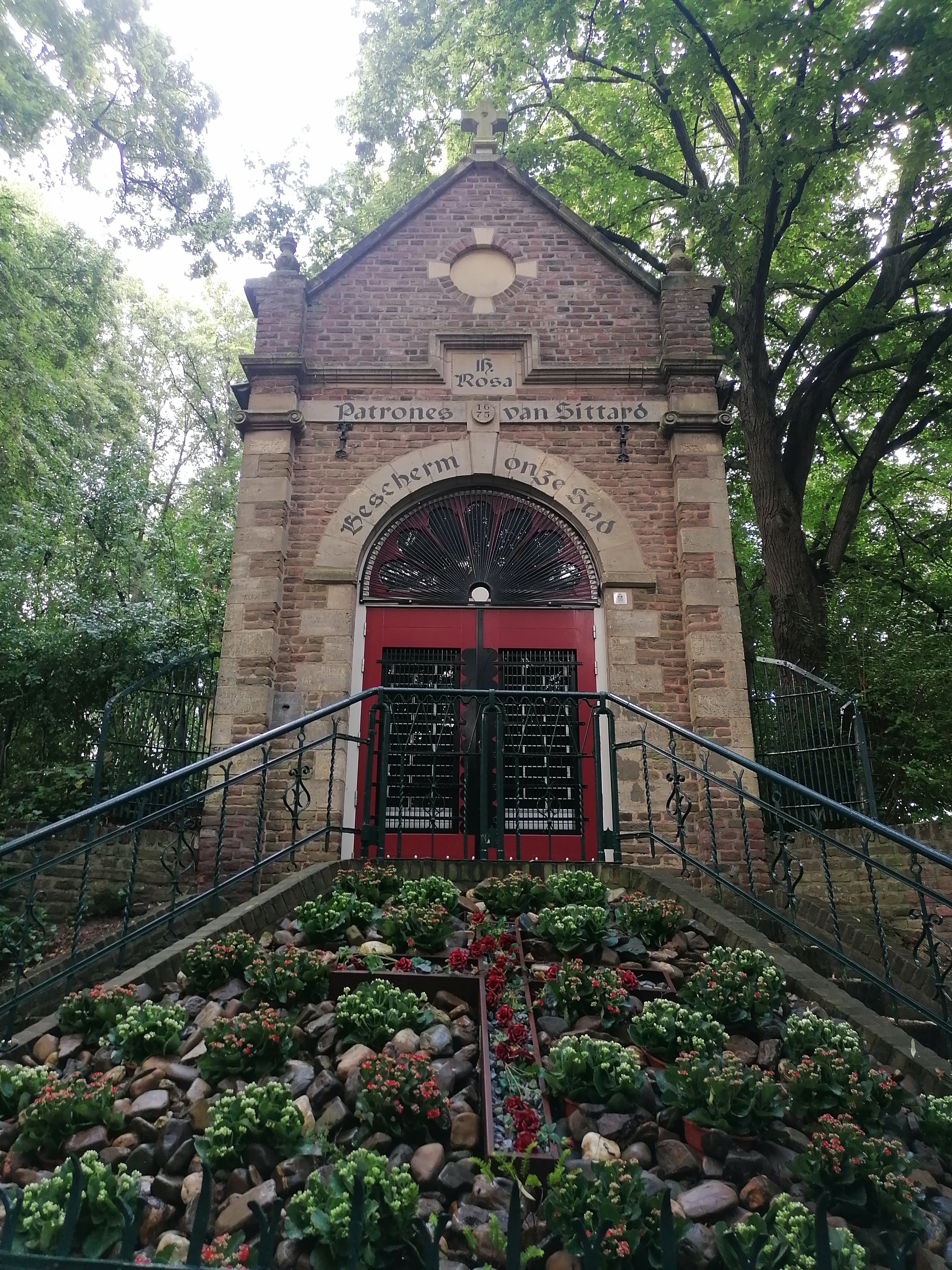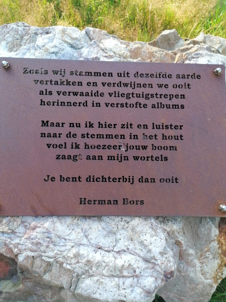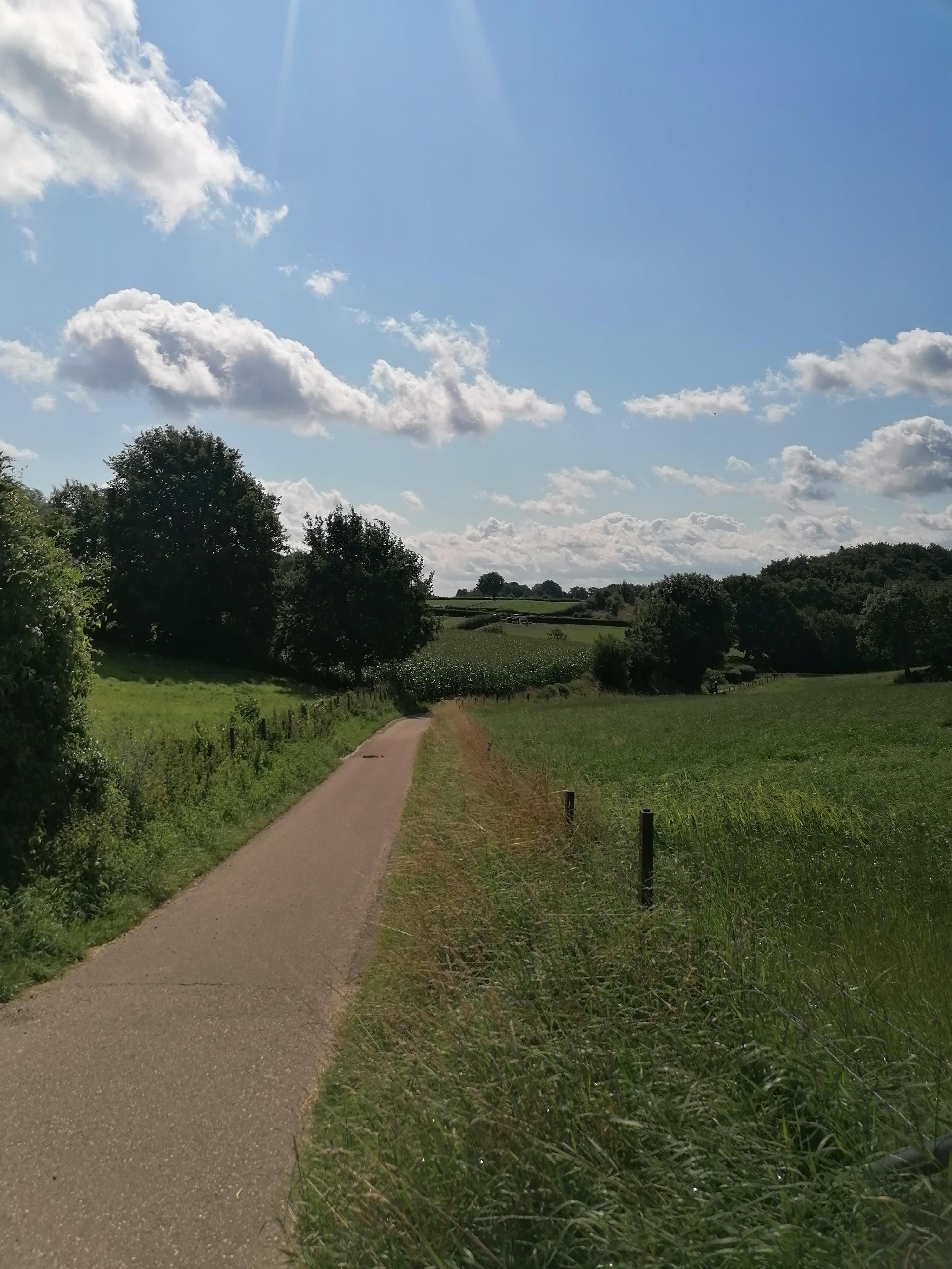 Na een gezellig avondje en lekker slapen bij mijn zusje en zwager, door grote  regenplassen op weg naar de kapel van St Rosa op de Kolleberg in Sittard en verder naar de Windraak. Behalve de vele brandnetels die hele smalle paadjes omzomen een fantastisch eerste deel van de wandeling. De wolken razen  langs de hemel en de buien trekken weg. Klimmen en dalen, modder en stenen maar de mooiste vergezichten. Vanaf Spaubeek samen  verder met mijn zusje. Bij Kasteel Terborg op het terras lekker koffie  en een praatje met 2 andere ‘Pieterpadders’ die ik al eerder in St. Odiliënberg zag. Ook dat is zo leuk van onderweg zijn, ervaringen delen met andere wandelaars…..Via een uitgesleten smal pad met de nog zichtbare gevolgen van de enorme regenval van enkele weken geleden, zoeken we voorzichtig onze weg omhoog om uiteindelijk op het plateau van Spaubeek uit te komen en dan….zon, wind, akkers, kruisbeelden, de watertoren van Schimmert in de verte…, puur genieten. Hoedje in de hand, anders waait het weg… Na het langzaam dalen rusten op een bankje, vakwerkhuizen, bloemen, carré-boerderijen met binnenplaatsen, kronkelpaadjes,  bos met hele hoge bomen, kleine waterstroompjes…,  beetje praten samen of gewoon stil zijn. Alles is goed.