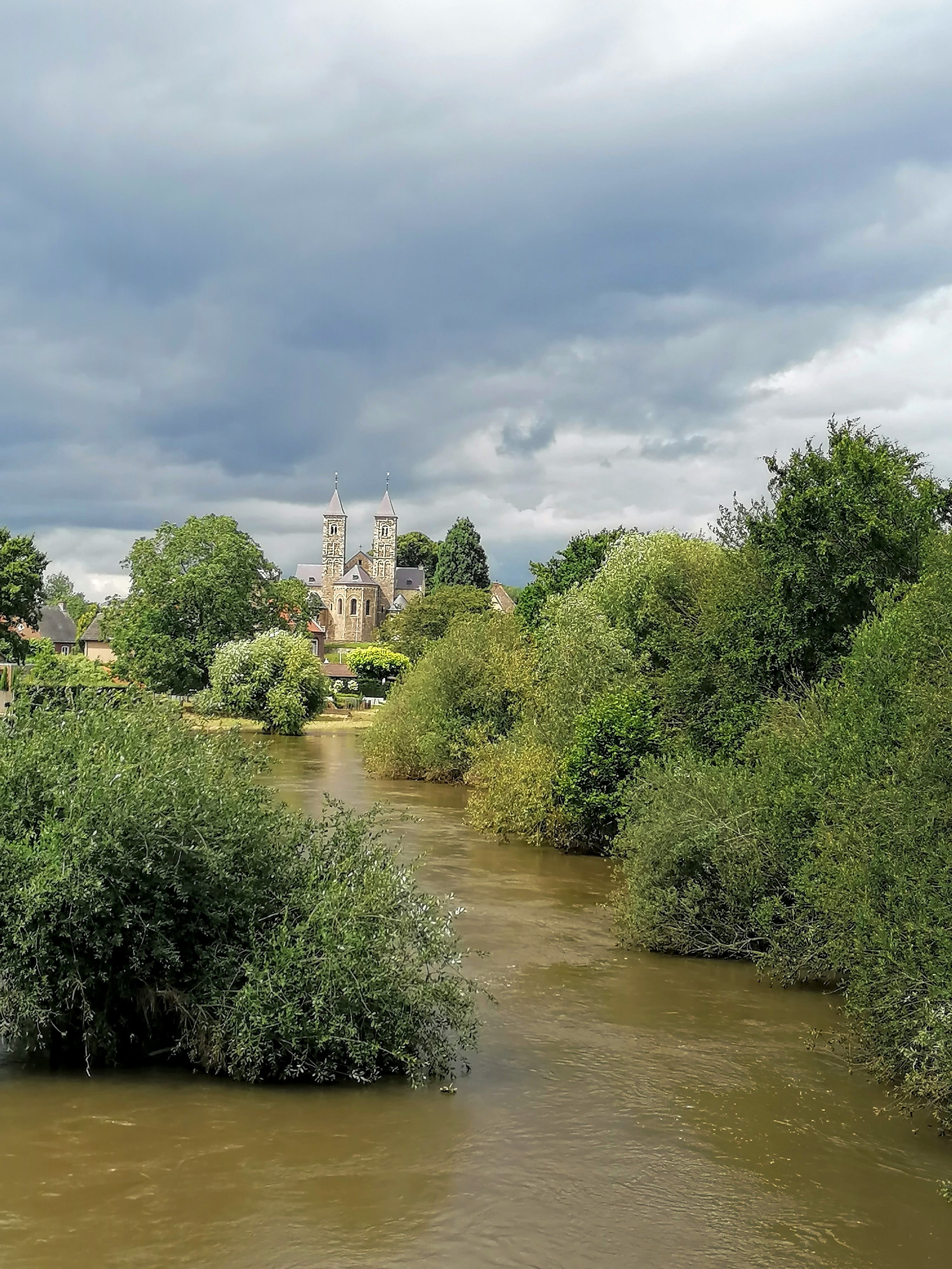 26 juli, al bijtijds met de auto naar Swalmen om daar de route weer op te pikken. Onder de indruk ben ik van Kasteel Hillenraedt. Al zo vaak gezien maar nu in de ochtendzon…, een plaatje. En het park  erachter zo mogelijk nog mooier.. Zilver en goud door de regendruppels op de bladeren en het zonlicht gefilterd door de bomen. Onderweg naar Maalbroek en Melick  door een overweldigend mooi, écht Midden-Limburgs- en bijna on-Nederlands landschap. Later zie ik in de vele  vernielde akkers de stille getuigen van de overstromingen veroorzaakt door de Roer. Maar de Basiliek van St. Odiliënberg schittert als altijd in de zon, zij het omringt door onweerswolken. Koffie op een leuke binnenplaats en door naar Montfort. De muggen kunnen mij niet deren, het bos is mooi en de bus terug naar Roermond  en Swalmen, bijna op tijd…. Wat een heerlijke dag.